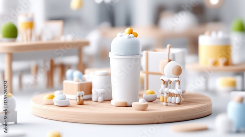 miniature, pastel, food, drink, cake, egg, drink, decor, scene, display, platform, wood, cute, design, illustration, three-dimensional, realistic, still life, sweet, yellow, blue, white, orange, delicious, colourful, modern, art, eatery, bakery, shop, hot drink, tea, accessory, minimal, spring, summer, aesthetic, simple