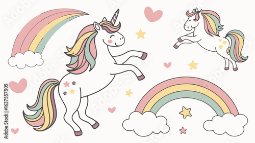 Whimsical Unicorns with Rainbows and Pastel Colored Elements.