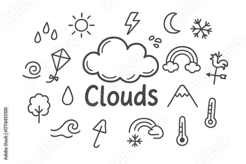 whimsical, weather, cloud, hand, drawn, doodle, illustration, middle, 1, bigger, central, drawing, fluffy, cloud, with, word, lettering, below, around, center, smaller