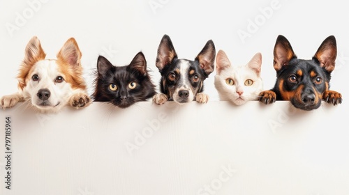 Whimsical web banner Cats and dogs peeking over white. Ai Generated.