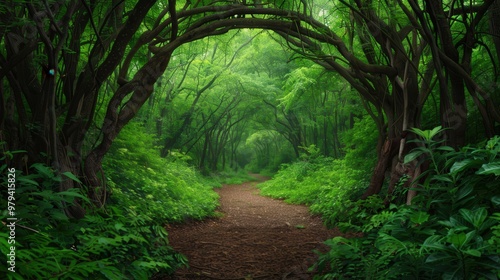 Whimsical Woodland Path, an enchanting forest scene featuring a winding trail through lush greenery, a serene atmosphere, inviting blank space for heartfelt postcard messages