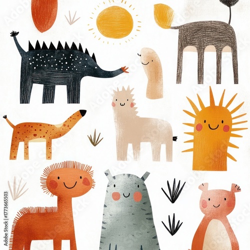 Whimsical zoo enclosure pattern with cartoon animals in child's drawing style