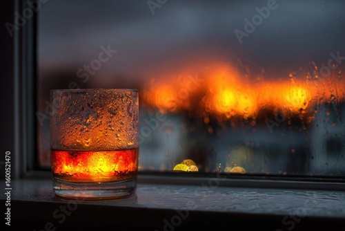 whiskey, glasses, window, rain, night, city, light, warm, amber, liquid, dark, stormy, cool, cold, drop, view, evening, illuminated, warmth, dusk, glow, texture, sharpened, close, edge, detail, exterior, light, illumination, calm, window sill, dramatic, soft