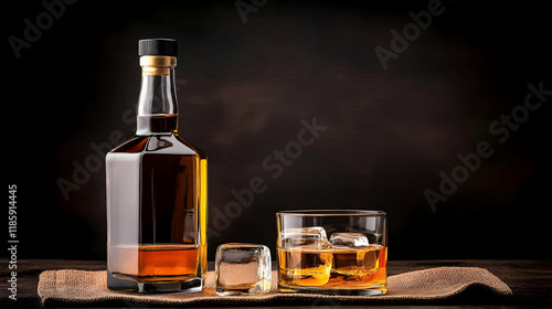 whiskey, ice, glasses, drink, alcohol, beverage, pour, bar, bottle, dark, liqueur, brown, spirit, amber, relax, enjoy, celebrate, party, cheer, elegant, sophisticated, luxury, lifestyle, evening, night, mood, cosy, warm, rustic, background, table, wood, texture, burlap, gold, light, shadow, still life, photo, closeup, product, advertising, commercial, delicious, smooth, aged, aroma, favor
