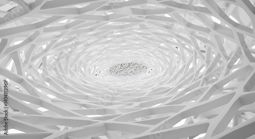 white, structure, wood, pattern, line, spiral, circular, design, architecture, abstract, texture, geometric, monochrome, background, grey, lattice, woven, nest, organic, depth, perspective, interior, tunnel, swirling, repeating, intertwined, concentric