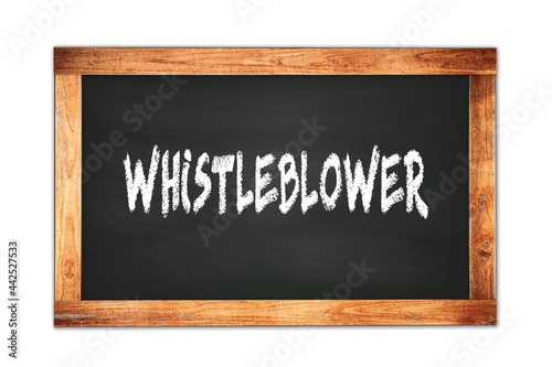 WHISTLEBLOWER text written on wooden frame school blackboard.