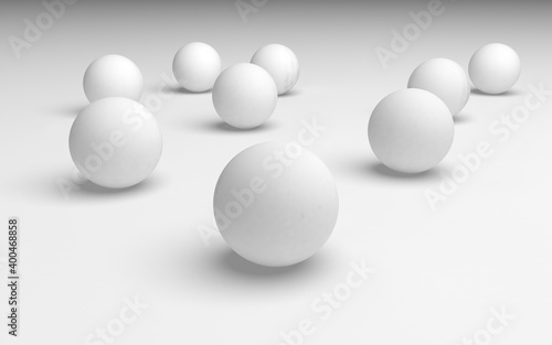 White abstract background. Set of white balls isolated on white backdrop. 3D illustration