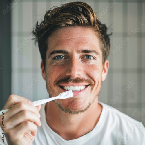 White american handsome man smiling brushing teeth