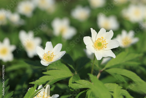 White anemone flowers blooming in a lush green forest in spring sunlight.