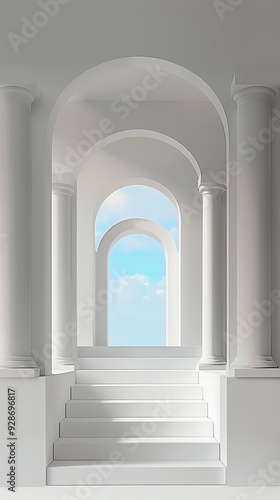archway, white, minimalism, architecture, pillar, stair, sky, cloud, blue, calmness, peace, clean, simple, geometric, abstract, modern, contemporary, interior design, hallway, doorway, passage, open, upward, ascent, perspective