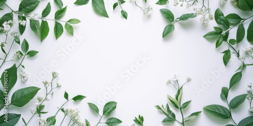 White background with green leaves and white flowers