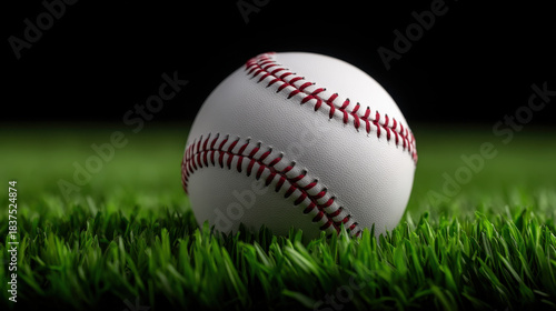 White baseball with red stitching resting on short green grass under dramatic lighting evokes sporty excitement and close up texture