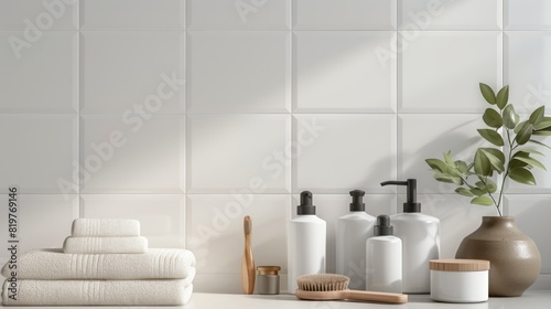 White Bathroom Counter With🧴, 🌿, And Folded Towels.