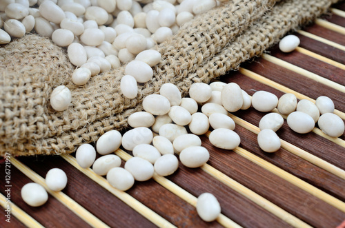 food, healthy, white, legume, grain, vegetable, bean, raw, organic, uncooked, heap, nourishment, ingredient, vegetarian, agriculture, diet, vegan, seed, product, sack, burlap, pile, wooden, table