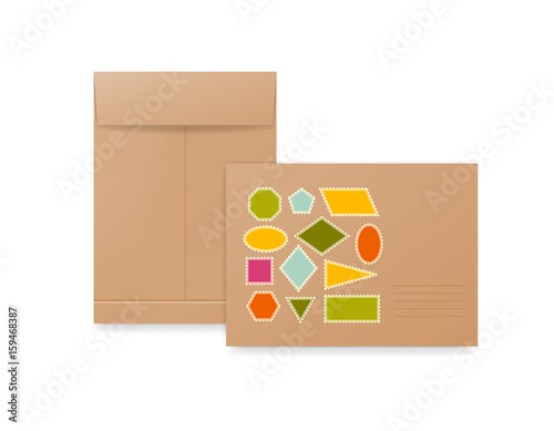 beige, brown, open, isolated, mail, vector, three-dimensional, address, background, blank, business, card, clean, concept, design, document, electronic mail, empty, envelope, icon, illustration, information, invitation, letter, message, mock, note, object, paper, post, postage, postal, postcard, realistic, shadow, size, symbol, template, up, package, set, collection, stamp, postmark, delivery, text, place