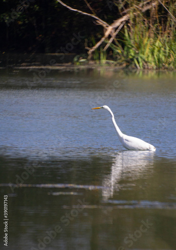 White bird fishing on The Swamp.The Great Egret (Ardea Alba), Also Known As The Common Egret or Great White Hilton. Builds Tree Nests in Colonies Close to Water.