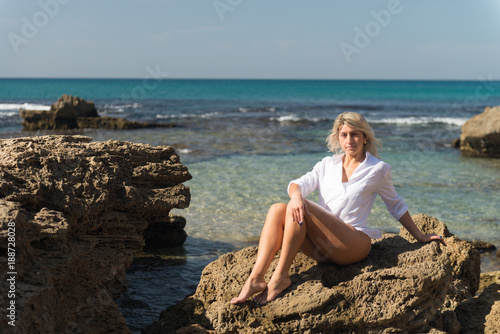 white blond female athlete sitting on the rock at the seaside in white shirt