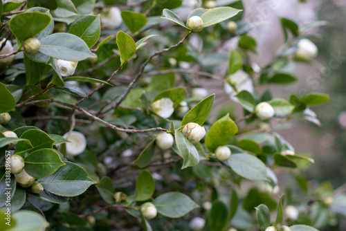 camelia, flower, white, bud, japanese garden, garden, abundance, blooming, leaf, leaf, foliage, green, flowering, plant, shrub, tree, beautiful, selective focus, blurred, flower, bloom, winter, spring, delicate, nature, botany, vegetation, aesthetic, flowering plant, botanical, horticulture, landscaping, decorative plant, bud, tree branch, twig, flora