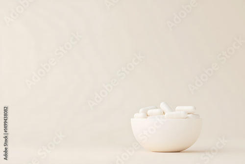 White capsules in a bowl, perfect for wellness and health ads. Minimalist design on neutral background with copy space for branding.