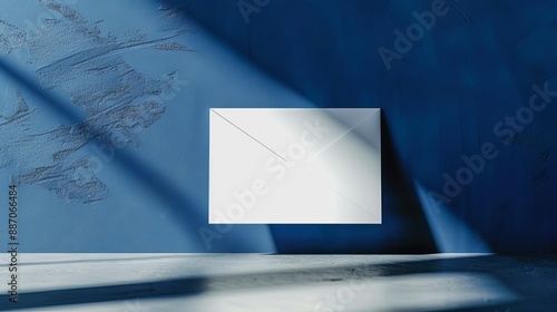White card mockup with a dark blue seal leaning against a blue wall Invitation mockup featuring long shadows