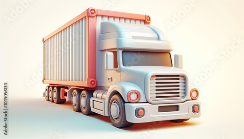 white, red, cargo, truck, delivery, transport, transportation, logistic, freight, container, trailer, semi, shipping, industry, commercial, vehicle, automotive, driving, road, highway, wheel, tire, headlamp, rear lamp, bumper, grille, cab, driver, business, isolated, background, white background, three-dimensional, rendering