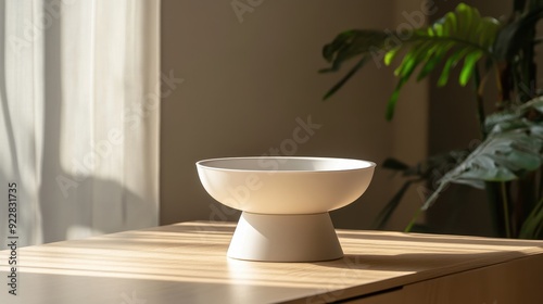 white bowl, wooden table, sunlight, plant, leaf, green, natural light, home decor, interior design, minimalist, modern, contemporary, simple, clean, elegant, stylish, empty, blank, space, copy space, background, texture, shadow, light, window