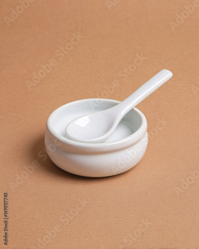 White Ceramic Bowl with Spoon on Brown Background