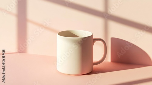 White Ceramic Mug on Pink Surface with Sunlight Shadows