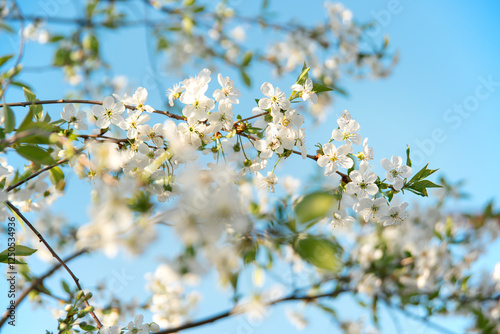 White cherry blossoms against clear blue sky in spring. Spring white flowers. The concept of purity, hope and renewal.