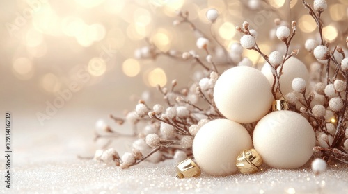 White Christmas ornaments with frosted branches and gold accents on a sparkly background.