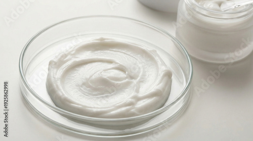 moisturiser, cream, cosmetic, glasses, dish, jar, white, texture, swirl, skincare, beauty, product, container, smooth, surface, round, laboratory, dermatology, health, hygiene, application, sample, display, clean, minimal, aesthetic, professional, isolated, closeup, glossy, light, background, soft, fluid, copy space