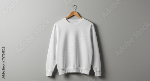 white, sweatshirt, hanger, wooden, grey, background, clothing, apparel, fashion, simple, plain, design, logotype, template, style, casual attire, comfortable, soft, cotton, fabric, texture, clean, minimal, blank, unisex, menswear, garment, sleeve, long, round, neck, collar, front, view, isolated, studio, photo, image, picture, graphic, element, asset, material, trend, wear, outfit