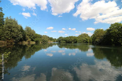 White cumulus clouds and blue sky reflecting on the water surface of the Zevenhuizerplas