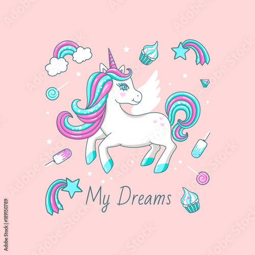 White cute unicorn with inscription - My dreams. For print design. Vector Illustration