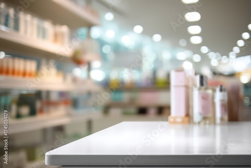white, table, surface, blurred, chemist's shop, pharmacy, interior, background, empty, display, product, health care, medicals, medicine, retail, shop, store, health, commercial, design, modern, clean, minimal, bottle, shelf, aisle, copy, space, foreground, cosmetic, wellness, concept, abstract, indoor, business, template, bright, day