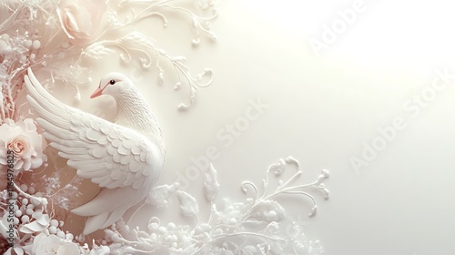 dove, white, floral, arrangement, flower, rose, branch, twig, delicate, elegant, peace, serenity, purity, calm, gentle, soft, subtile, cream, ivory, background, design, art, image, illustration, graphic, texture, minimalist, simple, ornate, sculpted, textured, feather, wing, beak, bird, symbol, hope, wedding, invitation, card, stationary, romantic, aesthetic, beauty, pastel