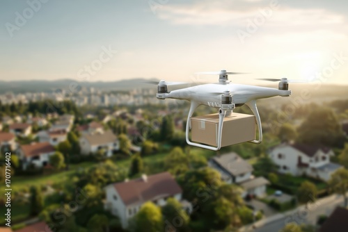White Drone Carrying Package Flying Over Green Suburban Landscape