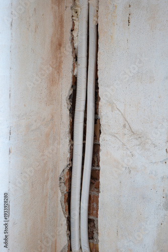 electrical, conduit, wall, grooved, groove, renovation, construction, in plaster, brick, white, corrugated, tube, wiring, installation, home, improvement, repair, house, building, interior, electricity, system, wire, route, vertical, detail, closeup, industrial, maintenance, component, hardware, utility, engineering, infrastructure, surface, residential, workspace, safety, functional, basic, architecture, design, masonry, material, unfinished, raw, texture, cabling