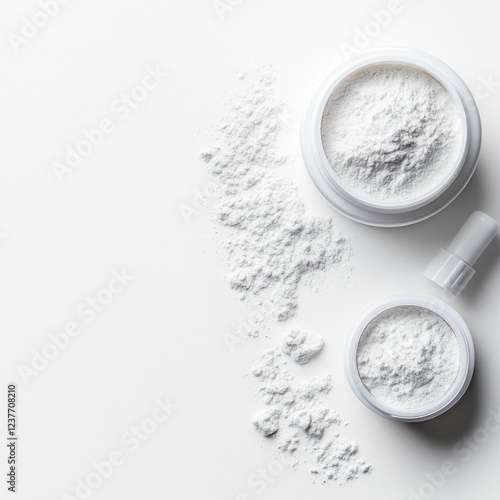 White Fine Powder in Containers on Clean Surface with Spilled Powder and Soft Shadows for Minimalist Aesthetic