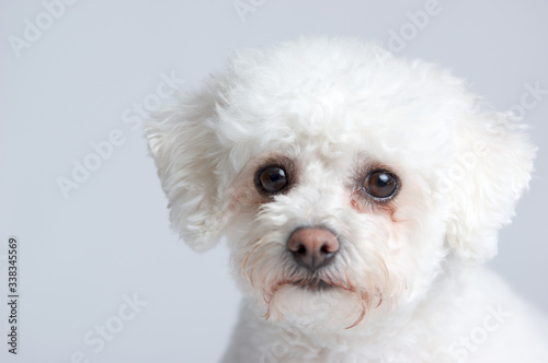 White fluffy Bichon Frise dog sitting down