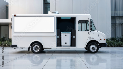 food, truck, mobile, cookery, eatery, kitchen, street, van, urban, modern, white, blank, menu, board, service, window, business, fast, meal, lunch, dinner, catering, vehicle, delivery, commercial, fresh, concept, transportation, parked, concrete, city, background, culinary, stainless, setup, preparation, snack, epicure, cook, chef, clean, minimal, architecture, sidewalk, professional, equipment, grill