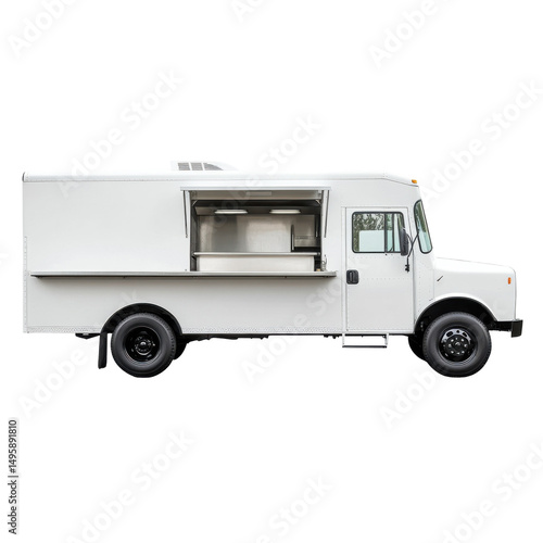 White Food Truck with Open Serving Window in Urban Setting, Ideal for Street Food Vendors and Events on transparent background