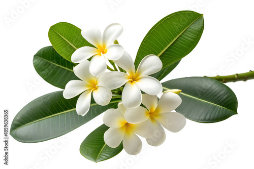 frangipani, plumeria, flower, white, yellow, center, flocked, tropical, hawaiian, bloom, flower petals, fragrant, tree branch, green, leaf, glossy, exotic, botanical, floral, delicate, elegant, summer, paradise, island, beauty, plant, shrub, evergreen, garden, spa, aromatherapy, wedding, decoration, perfume, wellness, fresh, natural, pure, lush, isolated, background, cut-out, stock, photo, image, closeup, macro