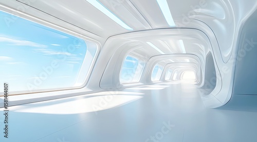 tunnel, future, white, architecture, interior, design, modern, corridor, empty, spaceship, window, light, sky, blue, clean, smooth, curve, perspective, passage, hallway, empty space, geometric, bright, futuristic, modernism, technology, minimalism, contemporary, exterior, view, hall, passageway, wide, endless, space