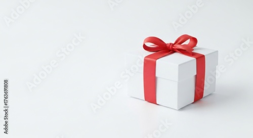 White gift box, red ribbon bow, clean minimalist aesthetic