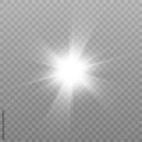 White glowing light explodes on a transparent background. Bright Star. Transparent shining sun, bright flash. Vector graphics.