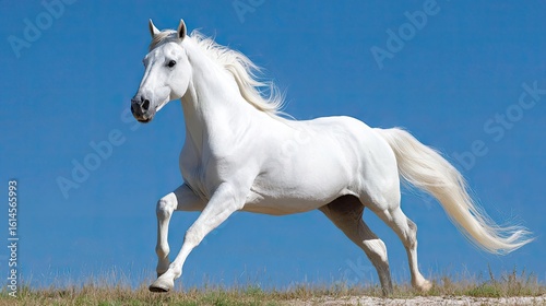 energy, horse, farm, grassy, swift, motion, detail, fast, landscape, speed, running, elegant, cloudless, horizon, field, scenic, blue, rural, meadow, majestic, sky, wild, outdoors, beautiful, nature, animal, sunny, mammal, white, vertebrate, equine, country, powerful, grass, light, freedom