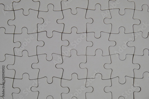 white jigsaw puzzle with missing puzzle for a text template. Above photo of isolated on the purple background