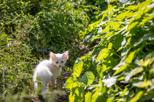 White kitten in the grass on blurred background at morning. Beautiful bokeh