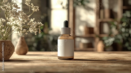 White label serum bottle, soft-focus cream background, wooden surface, subtle light play, clean and soft composition.